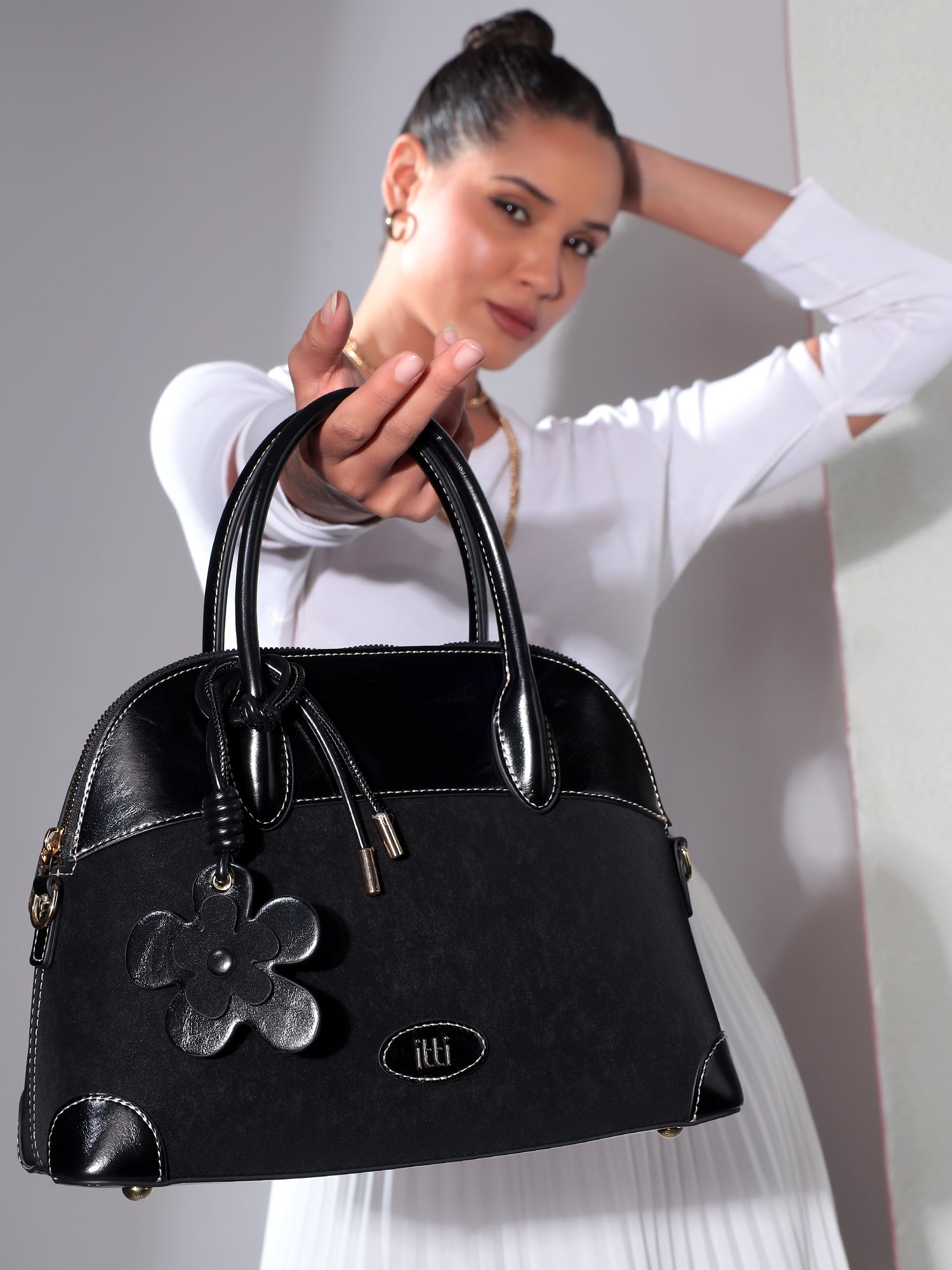 The Nina Handbag is a stunning statement piece that combines elegance with everyday practicality. Featuring a charming flower accent on the front, this feminine design showcases bold color blocking with a sophisticated mix of shiny and matte finishes that catch the light beautifully. The thoughtful construction balances texture and visual interest, making it a versatile companion for any occasion. Plus, it comes complete with a matching wallet, giving you everything you need in one coordinated set. Elevate your accessory game with the Nina—where style meets substance.